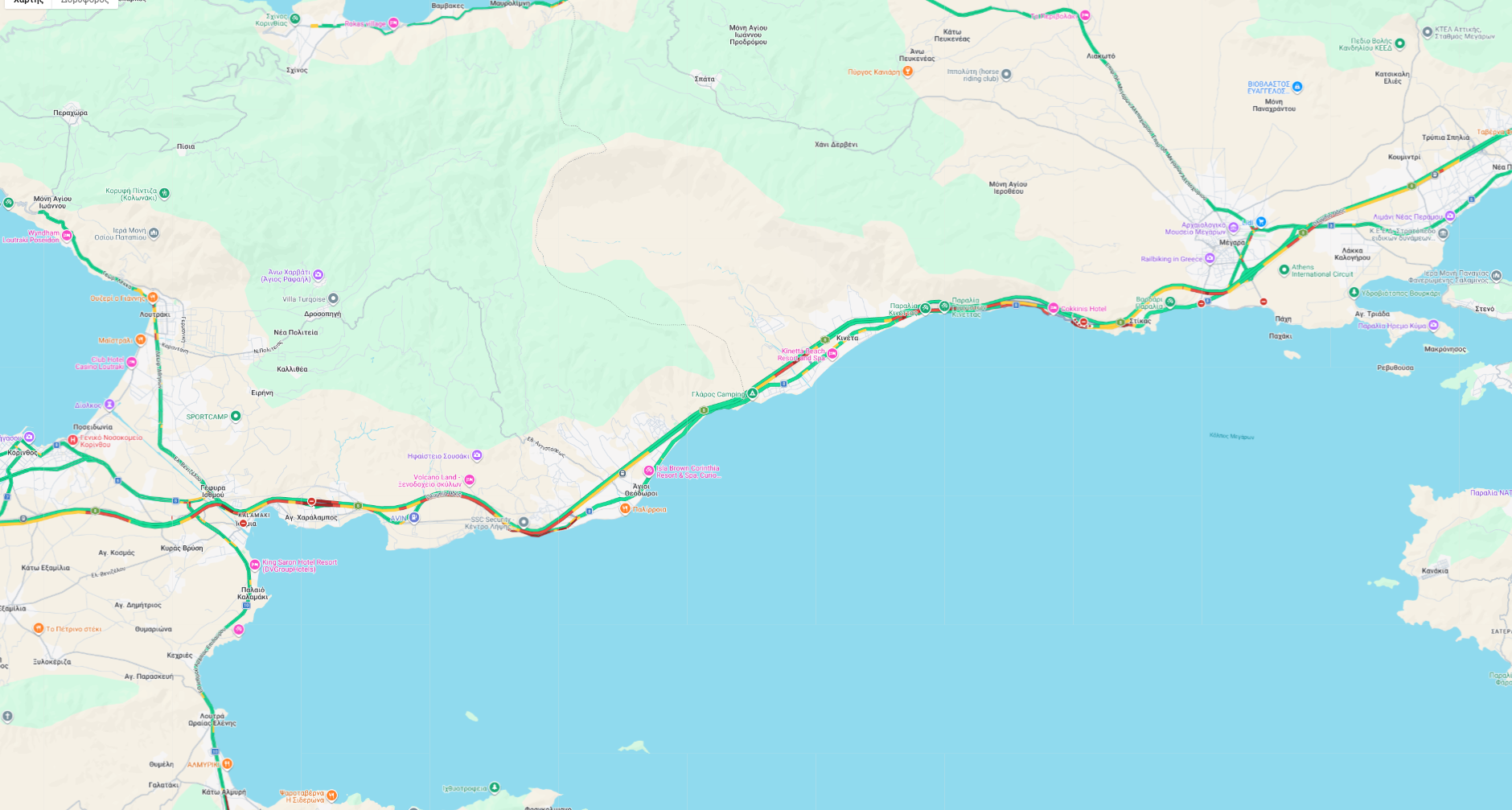Η κίνηση ίναι αυξημένη στο ρεύμα εισόδου στην Εθνική Οδό Αθηνών-Κορίνθου. Ειδικότερα, τα προβλήματα αρχίζουν λίγο μετά το Κιάτο από όπου τα οχήματα κινούνται με χαμηλές ταχύτητες, και κατά διαστήματα ακινητοποιούνται, έως και τους Αγίους Θεοδώρους και στη συνέχεια από την Κινέτα μέχρι τη Νέα Πέραμο.