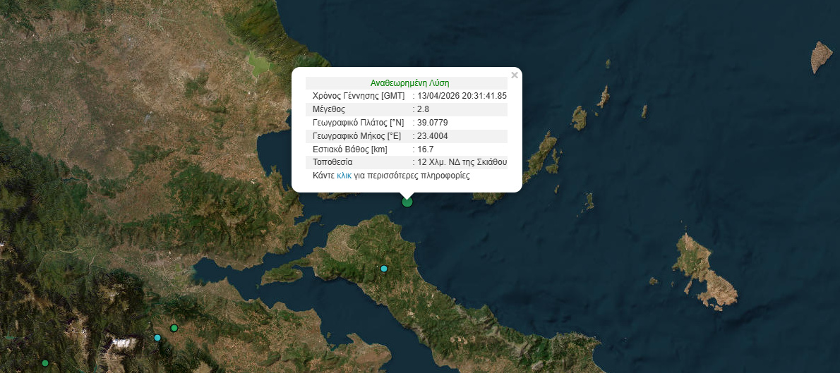 Συγκεκριμένα, σύμφωνα με το Γεωδυναμικό Ινστιτούτο το επίκεντρο της δόνησης ήταν στα 12 χιλιόμετρα ΝΔ της Σκιάθου.