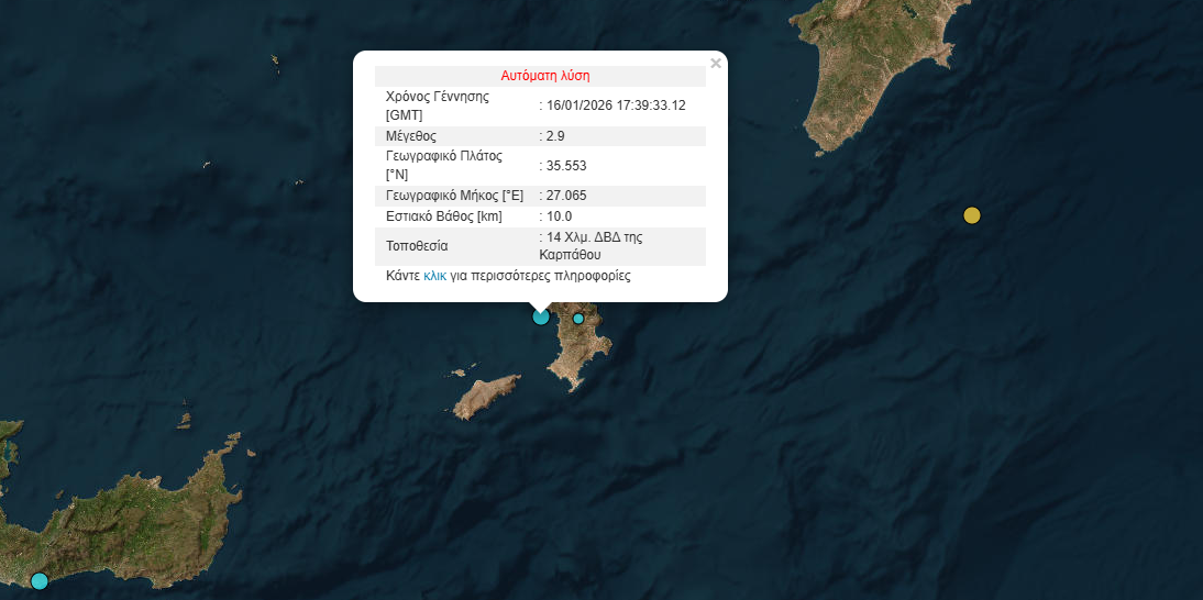 Σεισμός μεγέθους 2,9 Ρίχτερ σημειώθηκε το βράδυ της Παρασκευής 16/1 ανοικτά της Καρπάθου.
