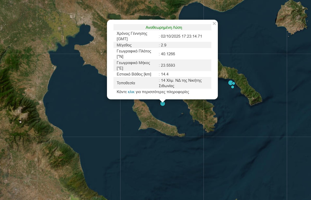 Σεισμική δόνηση μεγέθους 2,9 βαθμών της κλίμακας Ρίχτερ σημειώθηκε το απόγευμα της Πέμπτης (02.10) στη Χαλκιδική.