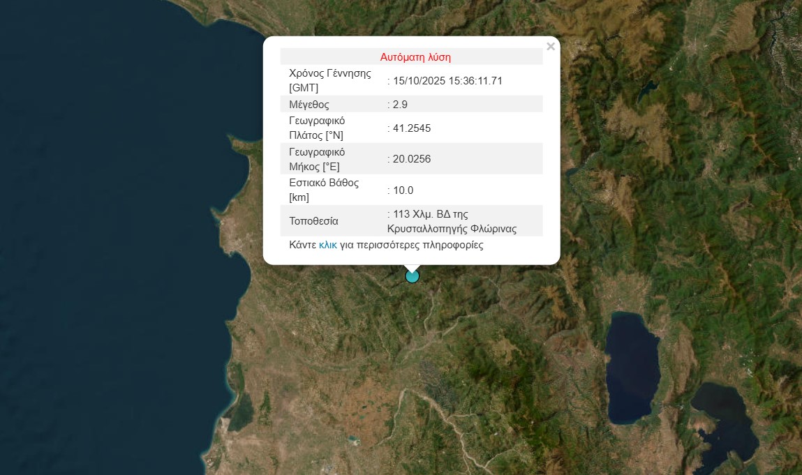 Σεισμική δόνηση μεγέθους 2,9 βαθμών της κλίμακας Ρίχτερ σημειώθηκε το απόγευμα της Τετάρτης (15.10) στη Φλώρινα.