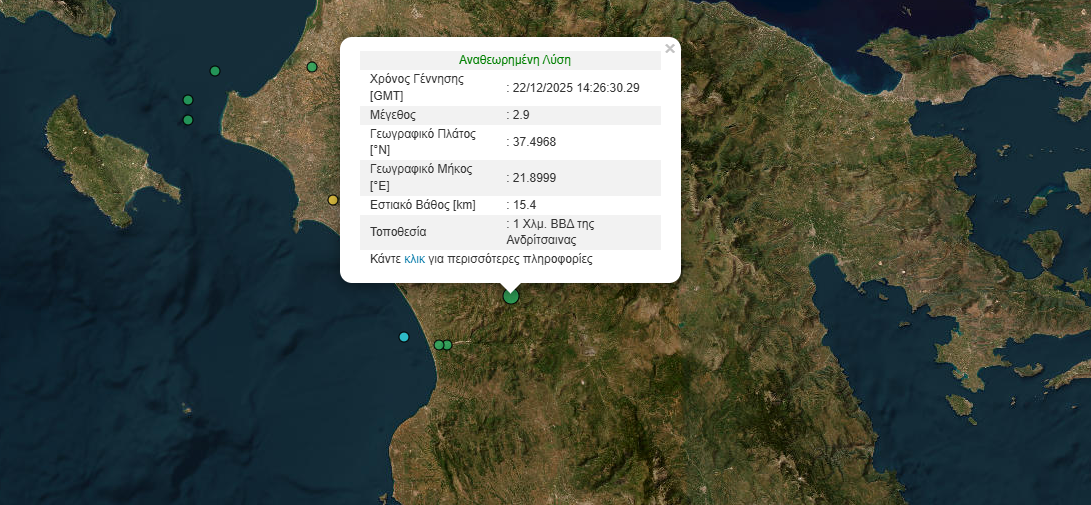 Σεισμός μεγέθους 2,9 Ρίχτερ σημειώθηκε στην Ανδρίτσαινα το μεσημέρι της Δευτέρας 22 Δεκεμβρίου.