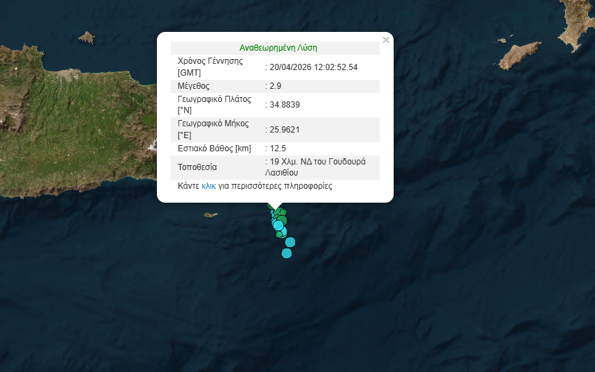 Σεισμός μεγέθους 2,9 Ρίχτερ σημειώθηκε το μεσημέρι της Δευτέρας 20/4 στο Λασίθι της Κρήτης.
