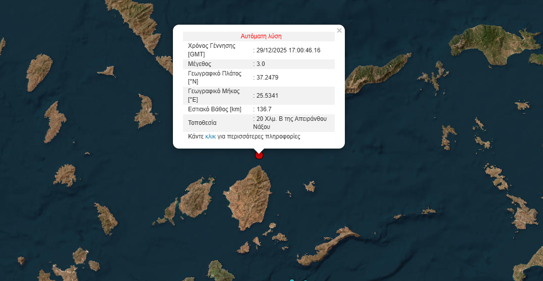 Το επίκεντρο της δόνησης ήταν στα 20 χιλιόμετρα βόρεια της Απειράνθου Νάξου, ενώ το εστιακό βάθος ήταν στα 136,7.