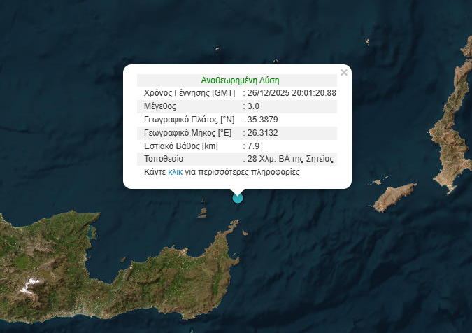 Συγκεκριμένα, το επίκεντρο της δόνησης ήταν στα 28 χιλιόμετρα ΒΑ της Σητείας, ενώ το εστιακό βάθος ήταν στα 7,9 χιλιόμετρα.
