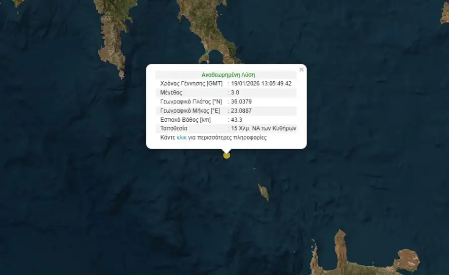 Σεισμός 3 Ρίχτερ κοντά στα Κύθηρα – Το εστιακό βάθος στα 43,3 χλμ