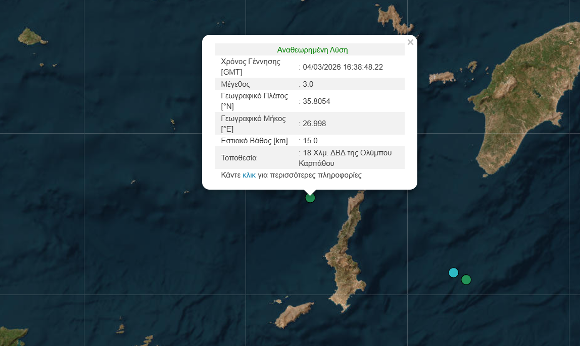 Σεισμική δόνηση μεγέθους 3 βαθμών της κλίμακας Ρίχτερ σημειώθηκε το απόγευμα της Τετάρτης (04.03) στην Κάρπαθο.