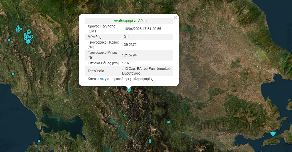 Συγκεκριμένα, το επίκεντρο της δόνησης ήταν στα 13 χιλιόμετρα ΒΑ Ραπτόπουλου Ευρυτανίας και το εστιακό βάθος στα 7,6 χιλιόμετρα.