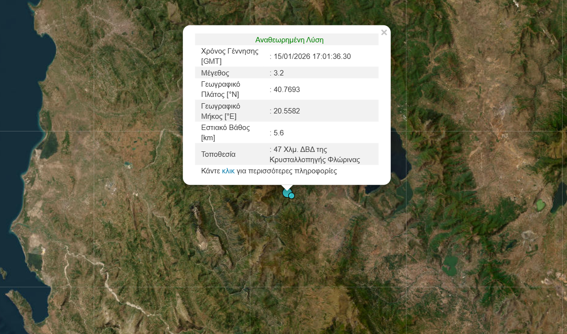 Σεισμική δόνηση μεγέθους 3,2 βαθμών της κλίμακας Ρίχτερ σημειώθηκε το απόγευμα της Πέμπτης (15.01) ανοιχτά της Φλώρινας.