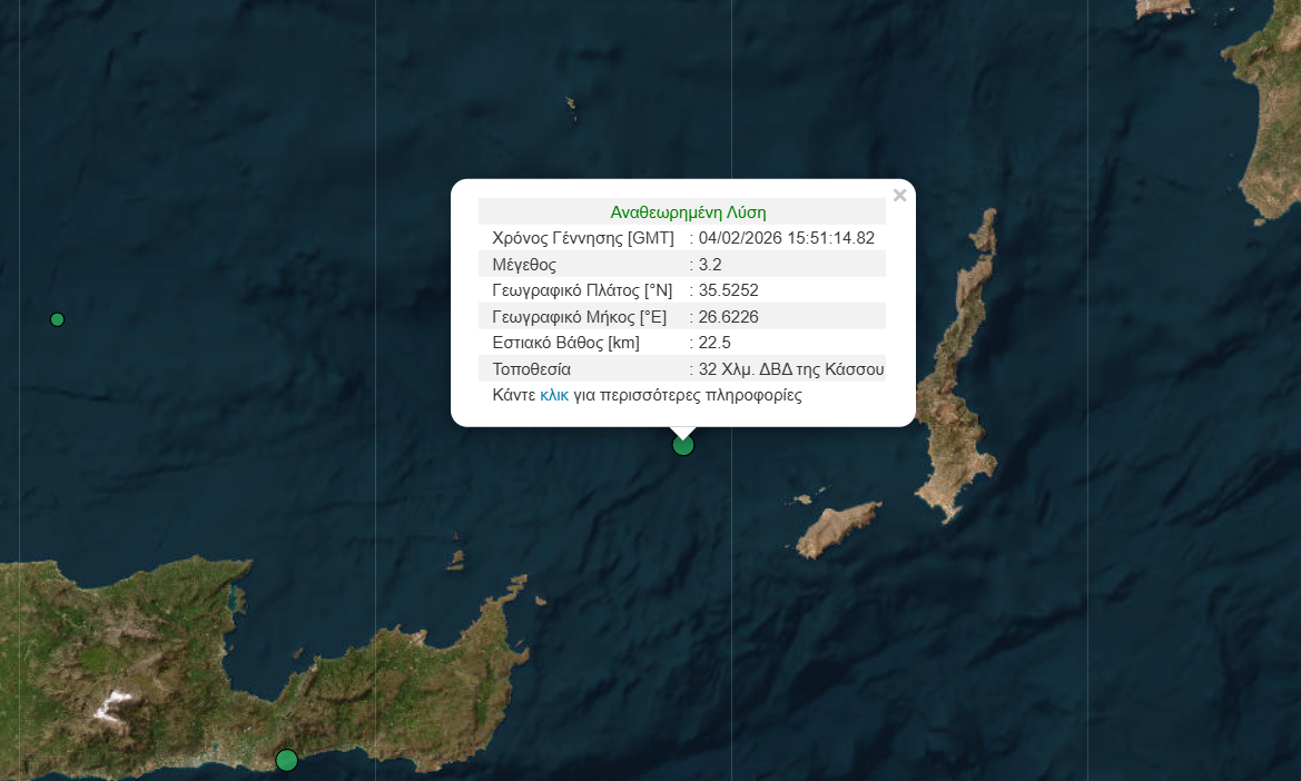 Σεισμική δόνηση μεγέθους 3,2 βαθμών της κλίμακας Ρίχτερ σημειώθηκε το απόγευμα της Τετάρτης (04.02) ανοιχτά της Κάσου.