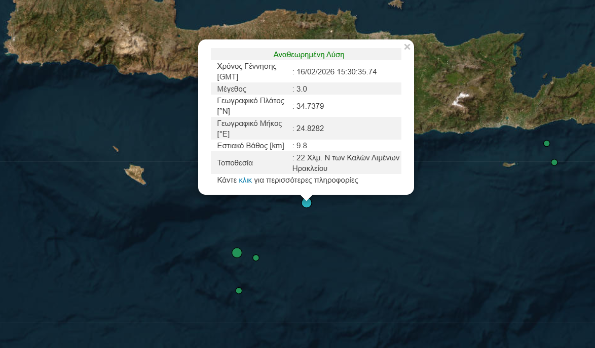 Σεισμική δόνηση μεγέθους 3 βαθμών της κλίμακας Ρίχτερ σημειώθηκε το απόγευμα της Δευτέρας (16.02) στο Ηράκλειο.