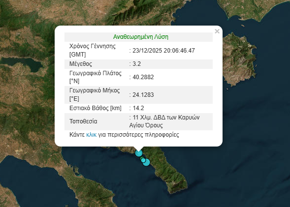 Σεισμός μεγέθους 3,2 Ρίχτερ σημειώθηκε στο Άγιο Όρος το βράδυ της Τρίτης 23 Δεκεμβρίου.