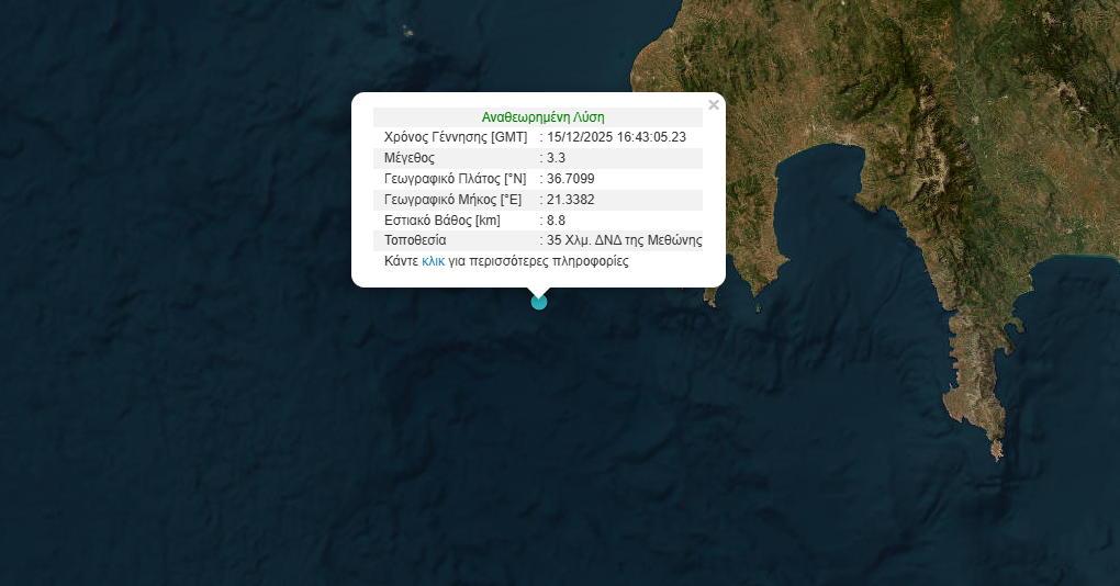 Σεισμός 3,3 Ρίχτερ σημειώθηκε το απόγευμα της Δευτέρας 15/12 ανοιχτά της Μεθώνης σύμφωνα με το Γεωδυναμικό Ινστιτούτο.