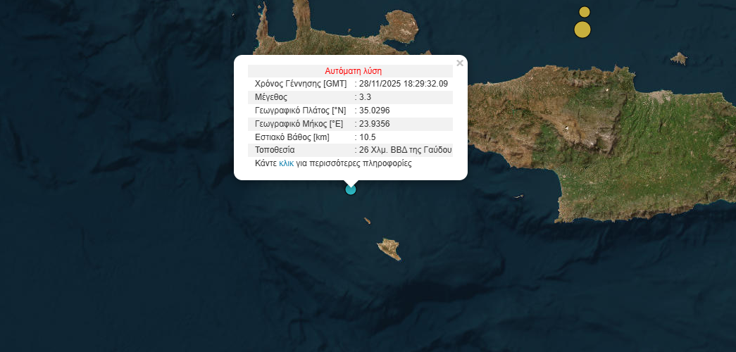Σεισμός μεγέθους 3,3 Ρίχτερ σημειώθηκε το βράδυ της Παρασκευής 28/11 ανοικτά της Γαύδου.