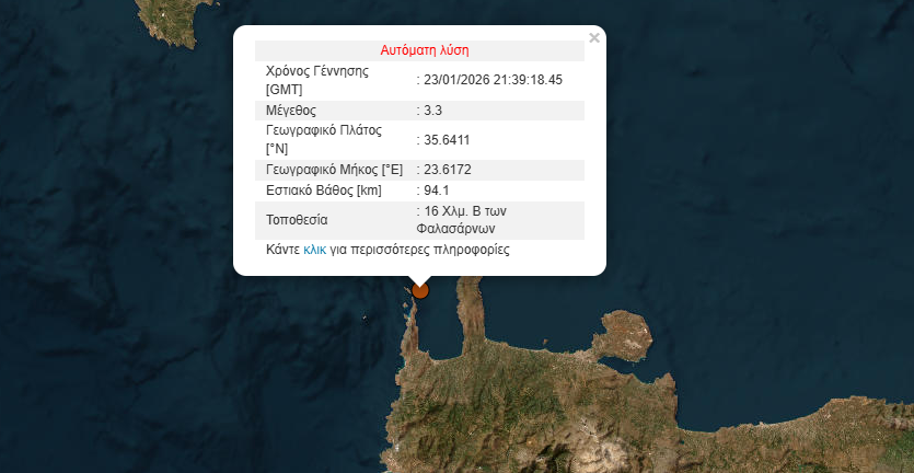 Σεισμός μεγέθους 3,3 Ρίχτερ ανοικτά των Φαλασάρνων στα Χανιά σημειώθηκε αργά το βράδυ της Παρασκευής 23/1.