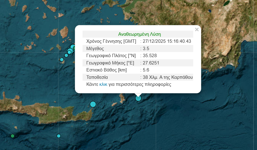 Σεισμός 3,4 Ρίχτερ που έγινε ιδιαίτερα αισθητός σημειώθηκε το απόγευμα του Σαββάτου (27/12) στην Κάρπαθο.