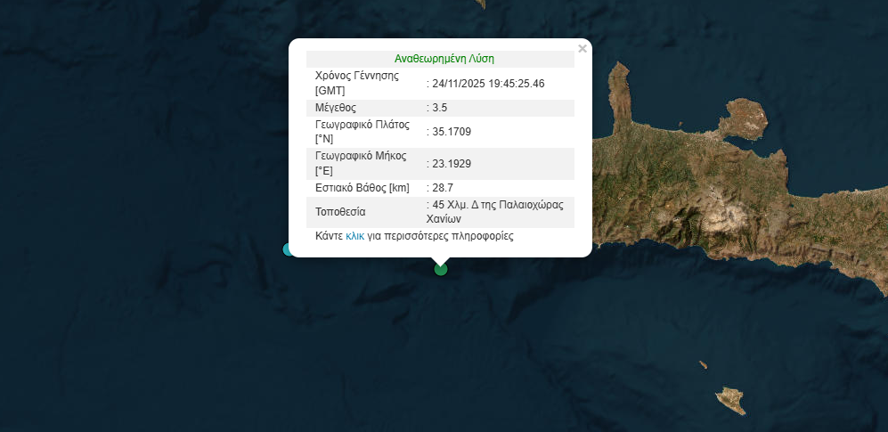 Συγκεκριμένα, το επίκεντρο ήταν στα 45 χιλιόμετρα Δ της Παλαιοχώρας Χανίων, με το εστιακό βάθος να είναι στα 28,7 χιλιόμετρα.