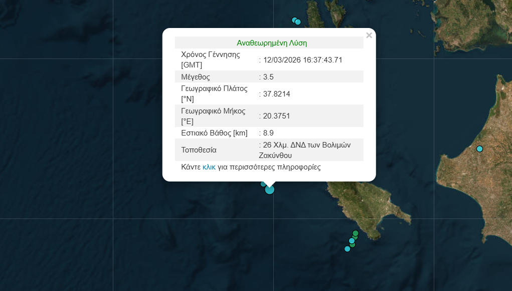 Σεισμική δόνηση μεγέθους 3,5 βαθμών της κλίμακας Ρίχτερ σημειώθηκε το απόγευμα της Πέμπτης (12.03) στη Ζάκυνθο.