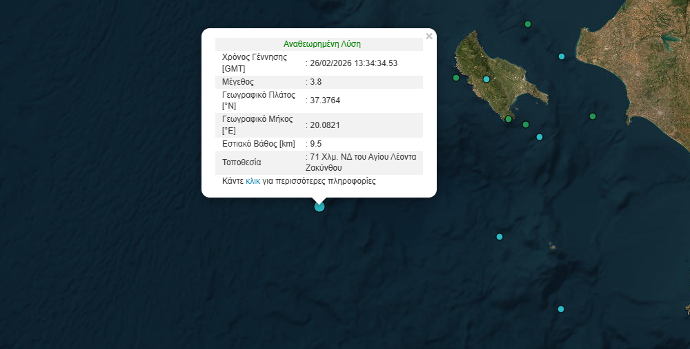 Σεισμός μεγέθους 3,8 Ρίχτερ σημειώθηκε το μεσημέρι της Πέμπτης 26 Φεβρουαρίου ανοικτά της Ζακύνθου.