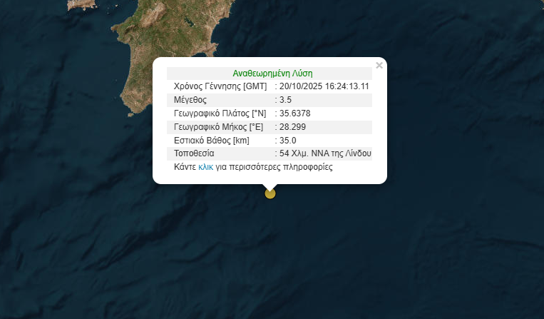 Σεισμός μεγέθους 3,5 Ρίχτερ σημειώθηκε το βράδυ της Δευτέρας 20/10 νοτιοανατολικά της Λίνδου στην Ρόδο.