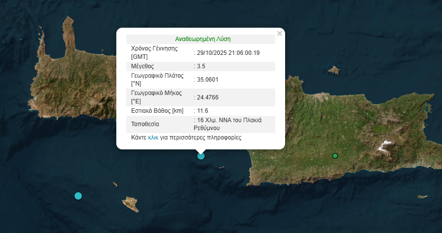 Σεισμός μεγέθους 3.5 Ρίχτερ σημειώθηκε το βράδυ της Τετάρτης 29/10 ανοικτά του Ρεθύμνου σύμφωνα με το Γεωδυναμικό Ινστιτούτο.