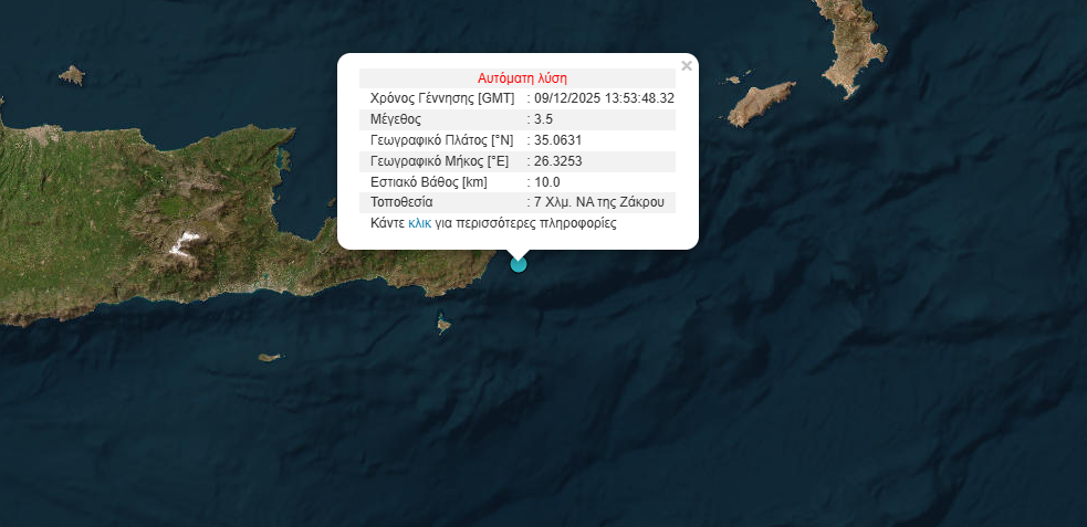 Σεισμός μεγέθους 3,5 Ρίχτερ σημειώθηκε το μεσημέρι της Τρίτης 9/12 ανοικτά της Ζάκρου στην Κρήτη.