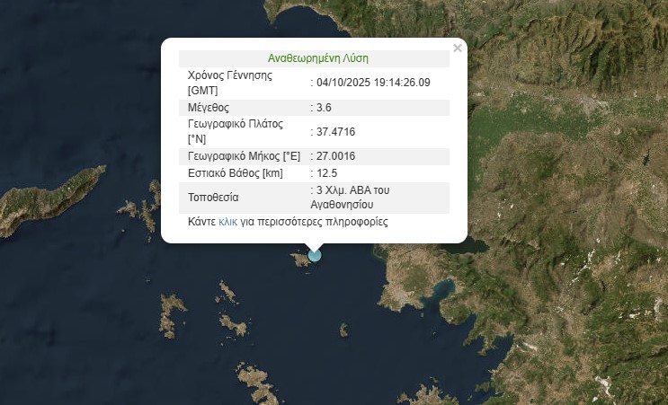 Σεισμός μεγέθους 3,6 Ρίχτερ σημειώθηκε το βράδυ του Σαββάτου 4/10 ανοικτά του Αγαθονησίου.