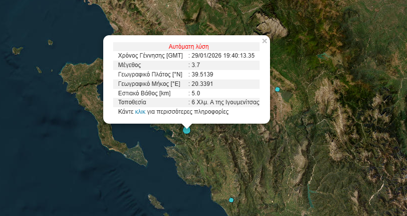 Σεισμός μεγέθους 3,7 Ρίχτερ σημειώθηκε το βράδυ της Πέμπτης 29/1 ανατολικά της Ηγουμενίτσας.