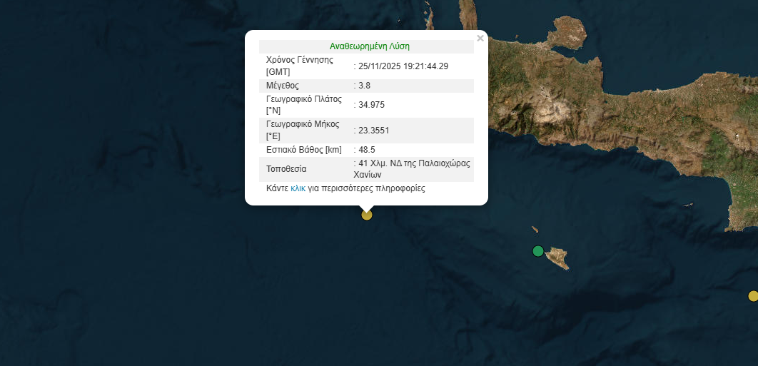 Συγκεκριμένα, το επίκεντρο της δόνησης ήταν στα 41 χιλιόμετρα ΝΔ της Παλαιοχώρας Χανίων, ενώ το εστιακό βάθος ήταν στα 48,5 χιλιόμετρα.