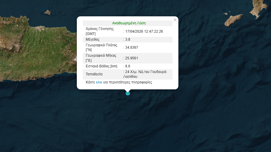Συγκεκριμένα, το επίκεντρο της δόνησης ήταν στα 24 χιλιόμετρα ΝΔ του Γουδουρά Λασιθίου, ενώ το εστιακό βάθος ήταν στα 8,6 χιλιόμετρα.