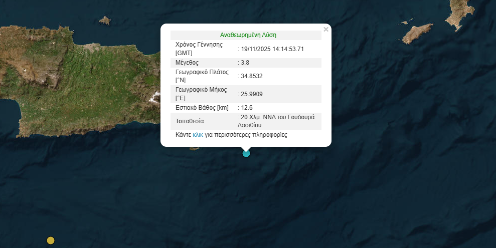 Σεισμός μεγέθους 3,9 Ρίχτερ σημειώθηκε το απόγευμα της Τετάρτης 19/11 ανοικτά του Λασιθίου της Κρήτης.
