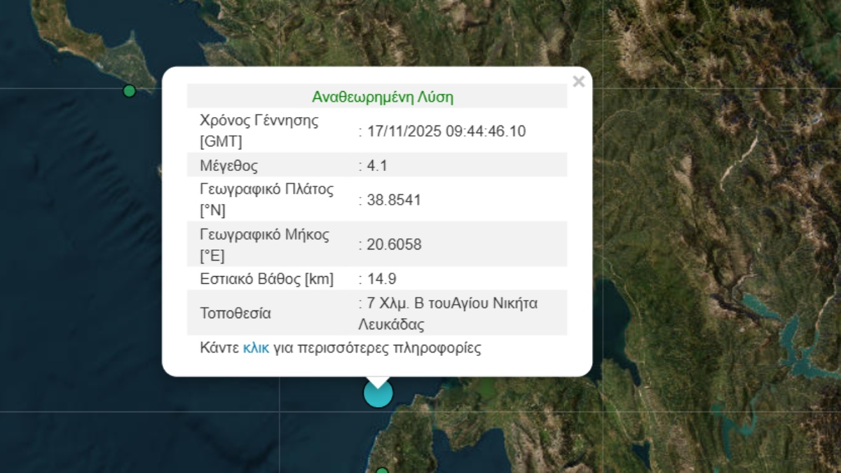 Ισχυρή σεισμός 4,1 Ρίχτερ σημειώθηκε λίγο μετά τις 12 το μεσημέρι στη Λευκάδα κοντά στην περιοχή Άγιος Νικήτας.