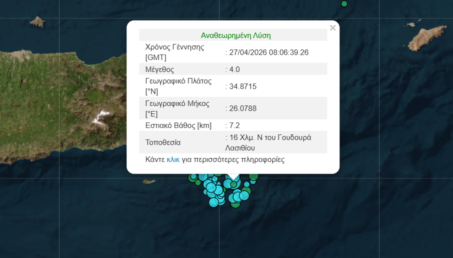 Το επίκεντρο της δόνησης εντοπίζεται στον θαλάσσιο χώρο 16 χιλιόμετρα νότια του Γουδουρά Λασιθίου.