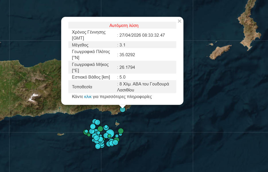 Μισή ώρα αργότερα ακόμη μία δόνηση 3,1 Ρίχτερ σημειώθηκε στη περιοχή του Λασιθίου όντας βέβαια πιο κοντά στην ακτή όπως δείχνει η αυτόματη λύση του Γεωδυναμικού Ινστιτούτο.