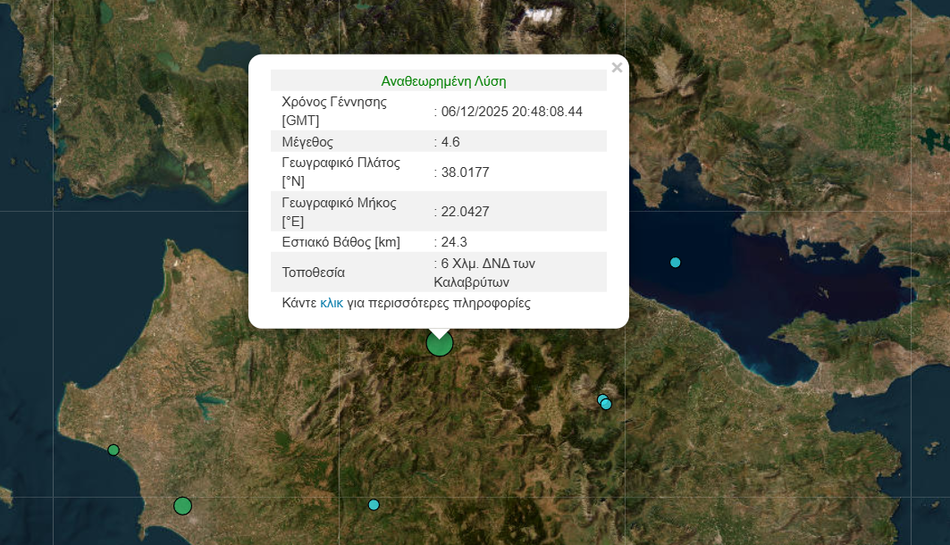 Συγκεκριμένα, σύμφωνα με το Γεωδυναμικό Ινστιτούτο, η σεισμική δόνηση είχε ως επίκεντρο τα 6 χιλιόμετρα ΔΝΔ των Καλαβρύτων, ενώ το εστιακό βάθος ήταν στα 24,3 χιλιόμετρα.