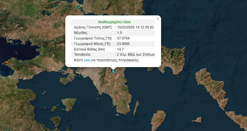 Σεισμός μεγέθους 1,5 Ρίχτερ σημειώθηκε το μεσημέρι της Κυριακής 15/3 στα Σπάτα.