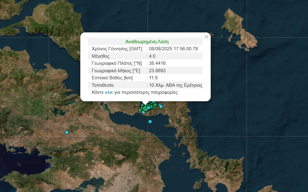 Συγκεκριμένα, σύμφωνα με την αυτόματη λύση του Γεωδυναμικού Ινστιτούτου το επίκεντρο της δόνησης ήταν στα 10 χιλιόμετρα ΑΒΑ της Ερέτριας.