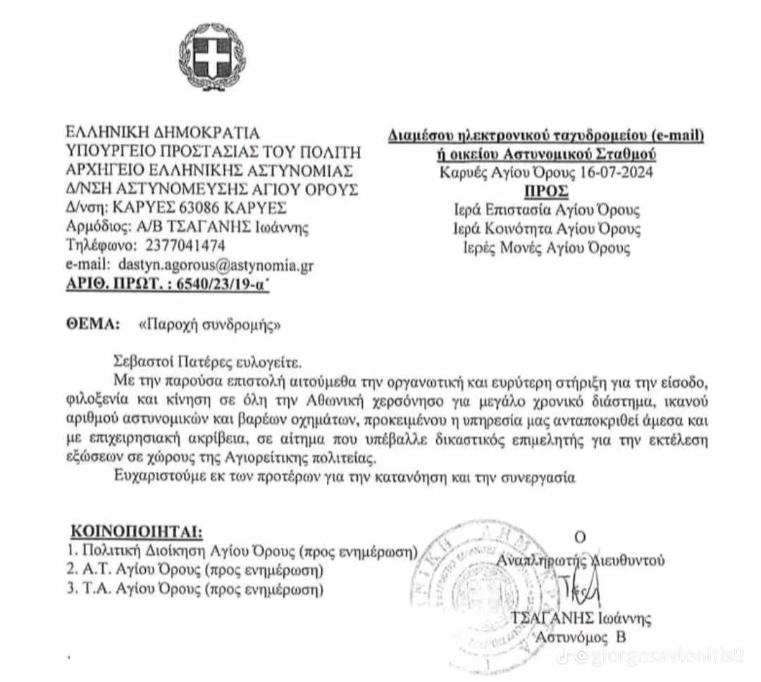 Το έγγραφο που διέρρευσε στάλθηκε τόσο στην Ιερά Επιστασία, όσο και στην Ιερά Κοινότητα, αλλά και σε όλα τα μοναστήρια. Δεν αναφέρει ωστόσο πόσοι αστυνομικοί θα μπουν, τι είδους βαρέα οχήματα θα μεταφέρουν και -το κυριότερο- πότε θα συμβεί αυτό.