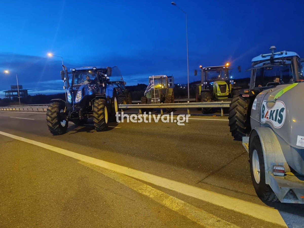 Νωρίτερα μπλόκο έστησε η ΕΛΑΣ στους αγρότες ώστε να μην βγάλουν τα τρακτέρ στο οδόστρωμα. Μετά από διαπραγματεύσεις με την Αστυνομία συμφωνήθηκε οι αγρότες να αποκλείσουν το ρεύμα της ΠΑΘΕ προς Θεσσαλονίκη κινούμενοι με τα πόδια.
