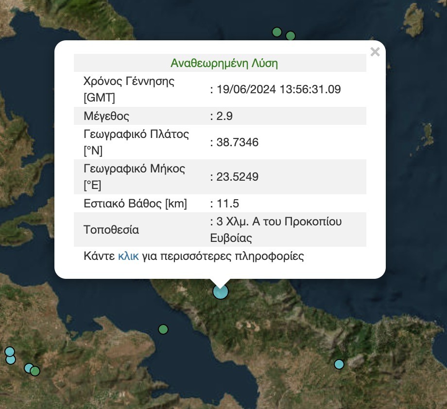 Συγκεκριμένα το επίκεντρο της δόνησης είναι στα 3 χιλιόμετρα Ανατολικά του Προκοπίου Ευβοίας και το εστιακό βάθος στα 11,5 χιλιόμετρα.