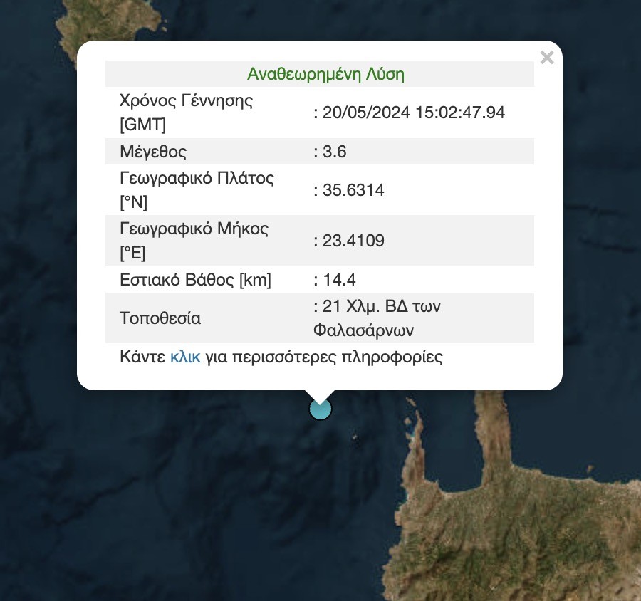 Ο σεισμός 3,6 βαθμών της κλίμακας Ρίχτερ είχε επίκεντρο 21 χιλιόμετρα Βορειοδυτικά των Φαλασάρνων Κρήτης και εστιακό βάθος 14,4 χιλιόμετρα.