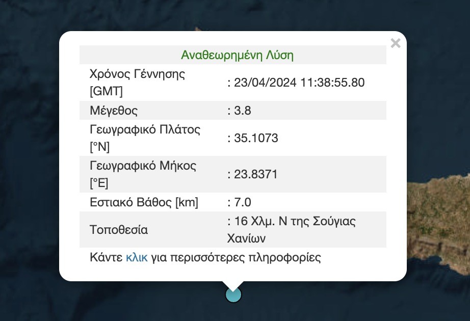 Σεισμός 3,8 βαθμών της κλίμακας Ρίχτερ σημειώθηκε το μεσημέρι της Τρίτης 23/4 ανοιχτά των Χανίων.