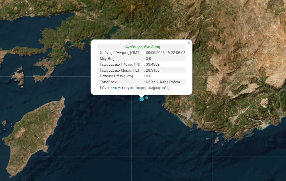 Όπως ανέφερε το Γεωδυναμικό Ινστιτούτο η δόνηση είχε εστιακό βάθος τα 6,6 χλμ, ενώ έγινε 62 χλμ ανατολικά της Ρόδου.