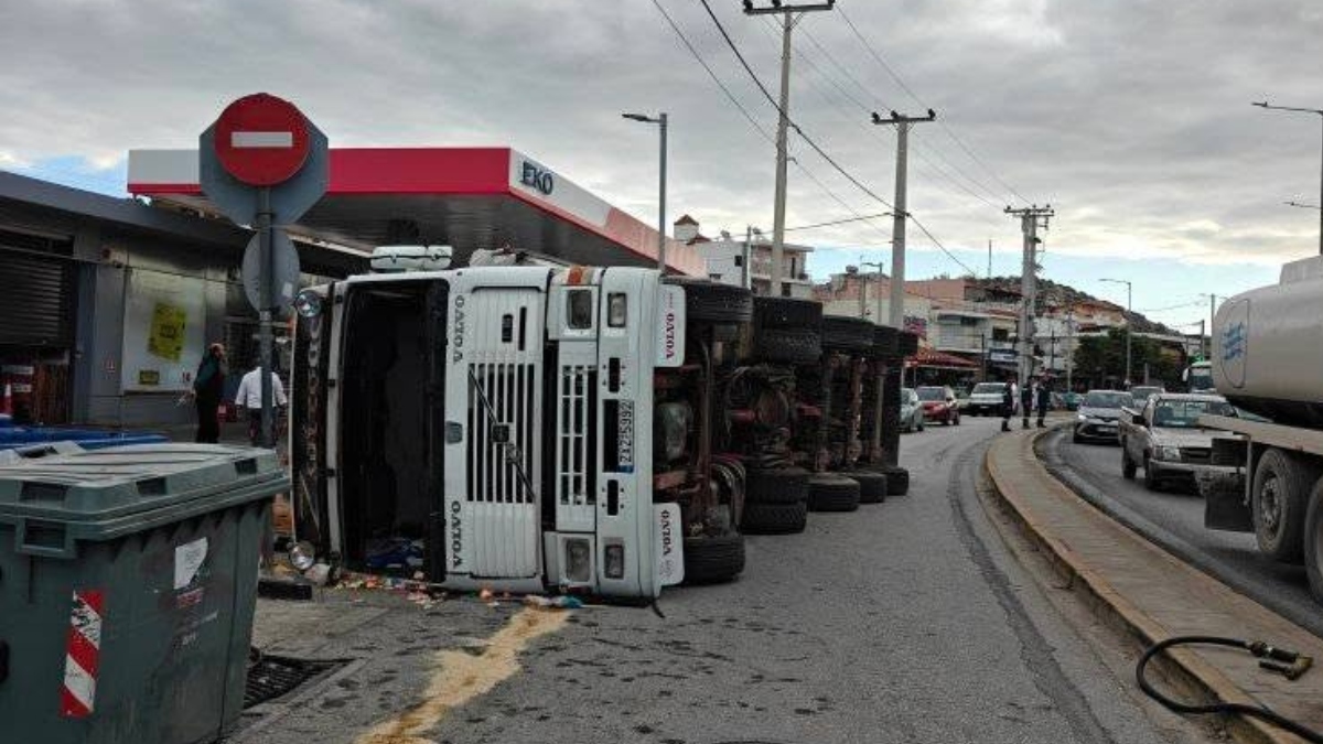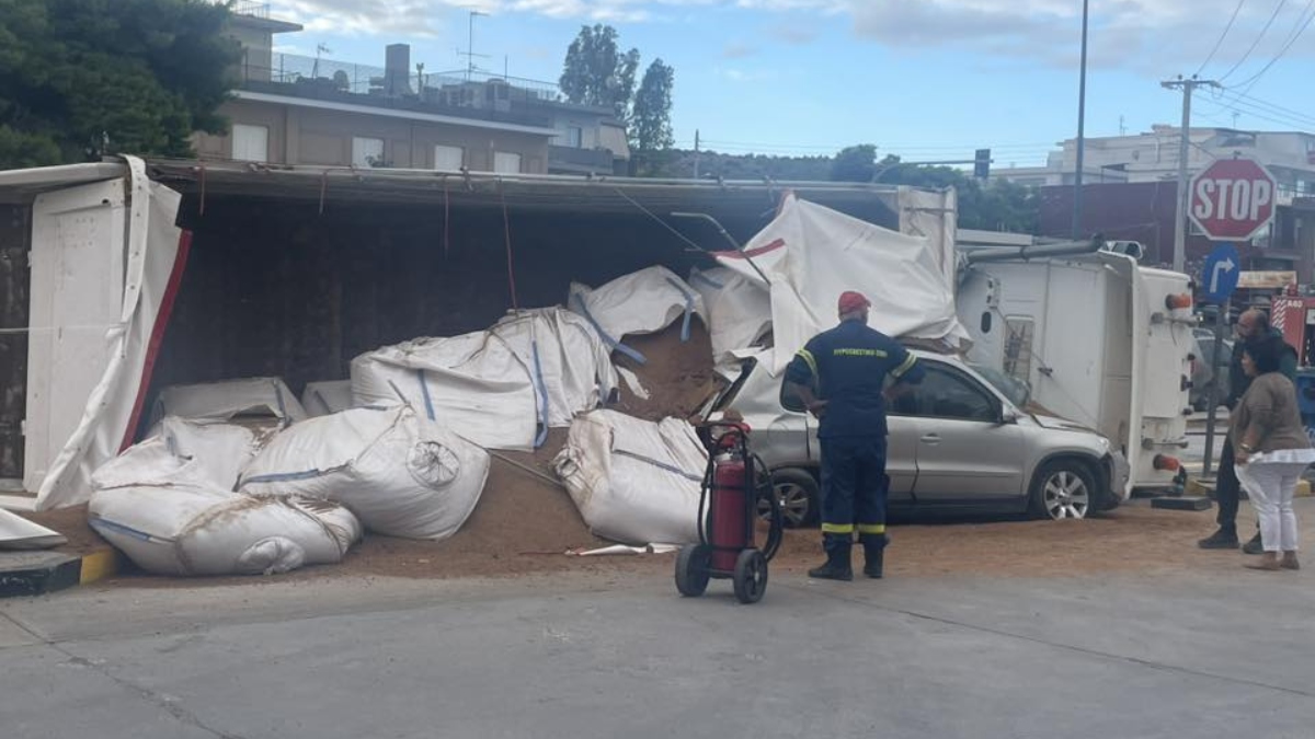Τροχαίο σημειώθηκε το πρωί της Τετάρτης στη Βάρη, όταν ένα φορτηγό ανετράπη και έπεσε πάνω σε ένα αυτοκίνητο.