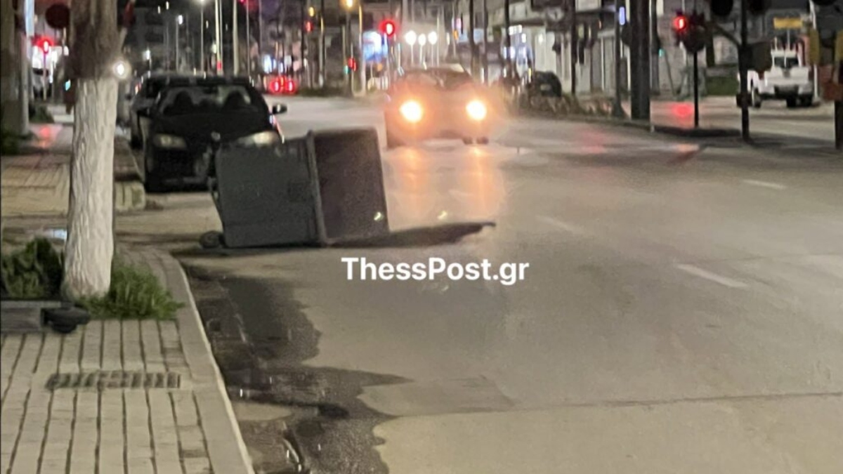 Στην οδό Μίκη Θεοδωράκη (πρώην Λαγκαδά) ο οδηγός ενός αυτοκινήτου δεν πρόλαβε να αντιδράσει όταν κάδος απορριμμάτων έπεσε στο όχημά του προκαλώντας φθορές.