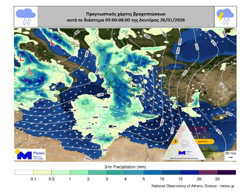 Σύμφωνα με τα διαθέσιμα προγνωστικά στοιχεία του Εθνικού Αστεροσκοπείου Αθηνών / Meteo.gr, τη Δευτέρα 26/01 αναμένονται ισχυρές βροχές και καταιγίδες στα δυτικά, σταδιακά στην Ανατολική Στερεά, στη Νότια και Ανατολική Πελοπόννησο, στην Εύβοια, στην Κεντρική και Ανατολική Στερεά, από τις προμεσημβρινές ώρες στην Κρήτη, στις Κυκλάδες από το μεσημέρι στις Σποράδες, στα νησιά του Βόρειου και Ανατολικού Αιγαίου και στα Δωδεκάνησα.