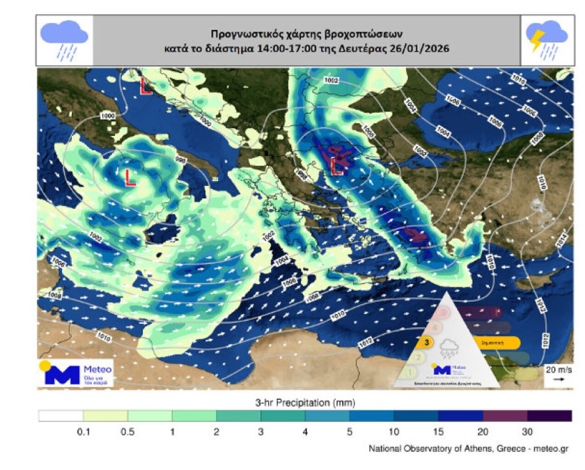 Πιο αναλυτικά ισχυρές βροχές και καταιγίδες θα σημειωθούν τη Δευτέρα (26-01-2026):