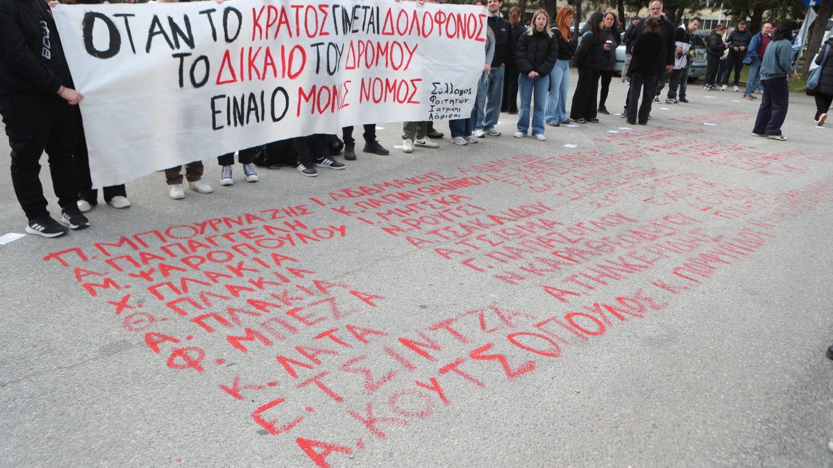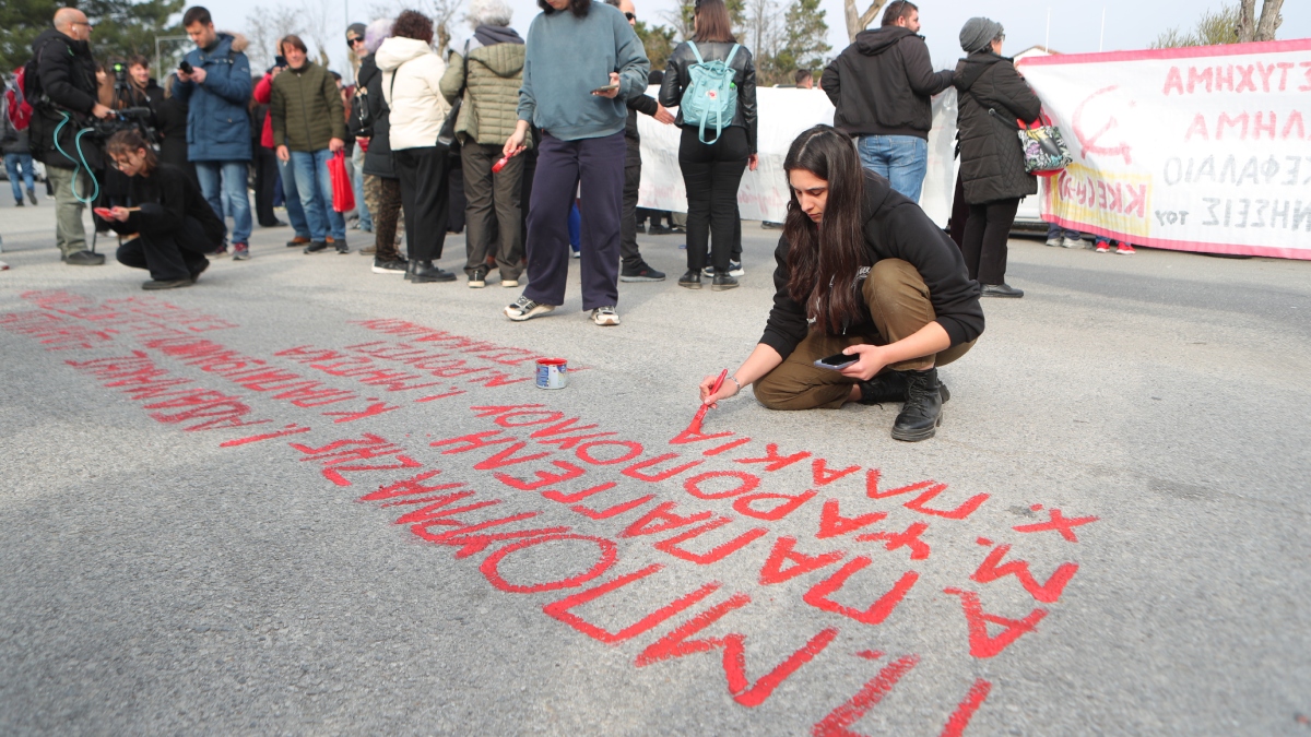 Ομάδα φοιτητών, που συμμετέχει στην κινητοποίηση απέναντι από το κτίριο όπου διεξάγεται η δίκη για το δυστύχημα στα Τέμπη, έγραψε με κόκκινη μπογιά τα ονόματα των θυμάτων στο έδαφος.