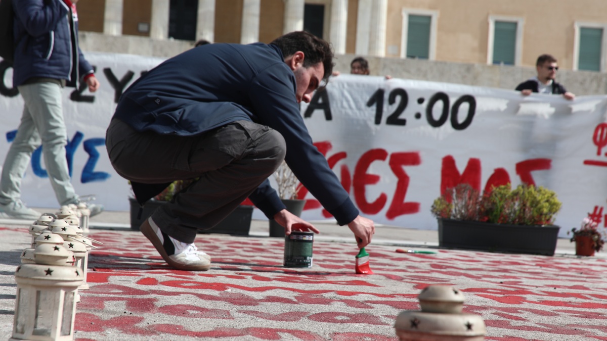 Όπως φαίνεται σε φωτογραφικό ντοκουμέντο του DEBATER, μέλη των φοιτητικών συλλογικοτήτων γραφούν ξανά τα ονόματα των 57 θυμάτων μπροστά από το μνημείο του Άγνωστου Στρατιώτη.