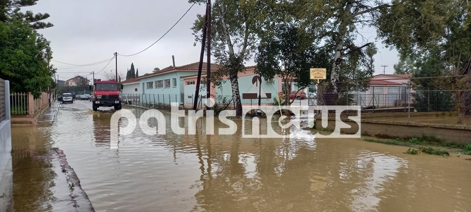 Σταδιακά με τρακτέρ και οχήματα της Πολιτικής Προστασίας του Δήμου Πηνειού μεταφέρουν τα παιδιά, καθώς οι γύρω δρόμοι έχουν πλημμυρίσει και οι γονείς δεν μπορούσαν να προσεγγίσουν το σχολείο.